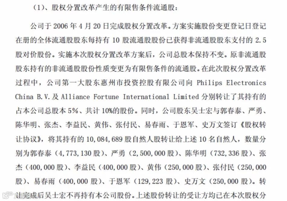 2006年,TCL股权分置改革完成后,惠州市国资委间接持有TCL集团12%以上股权,仍为“实际控制人”。公司2008年年报中还将惠州市国资委认定为公司实际控制人。
