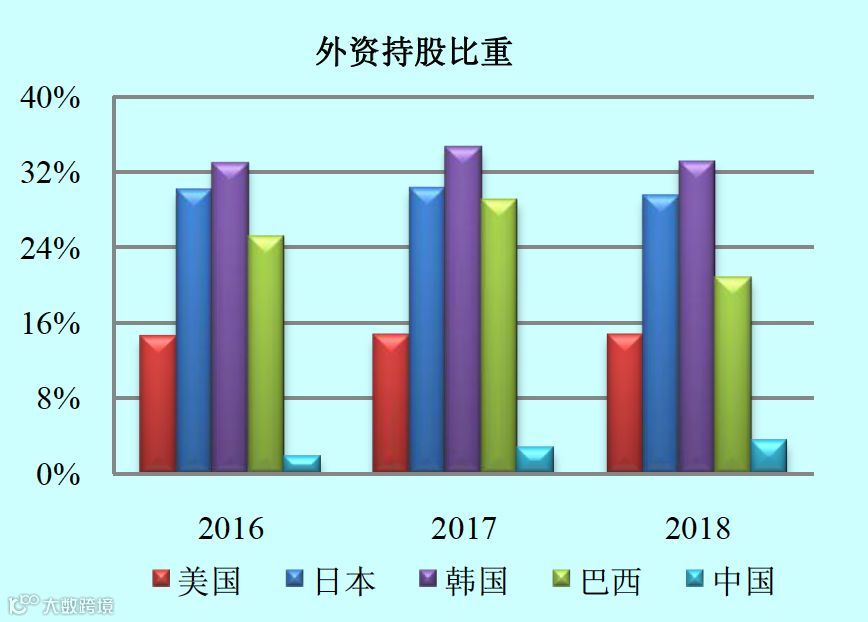 《2018年中国国际收支报告》中的数据显示,从2018年末的股市数据看,外资持股占美国股市总份额的15%,日本占比为30%,巴西占比为21%,韩国为33%,而我国的外资持股占境内流通股票市值的比例为3.5%,不仅远低于日本和美国等发达国家,还低于韩国和巴西等新兴市场国家。