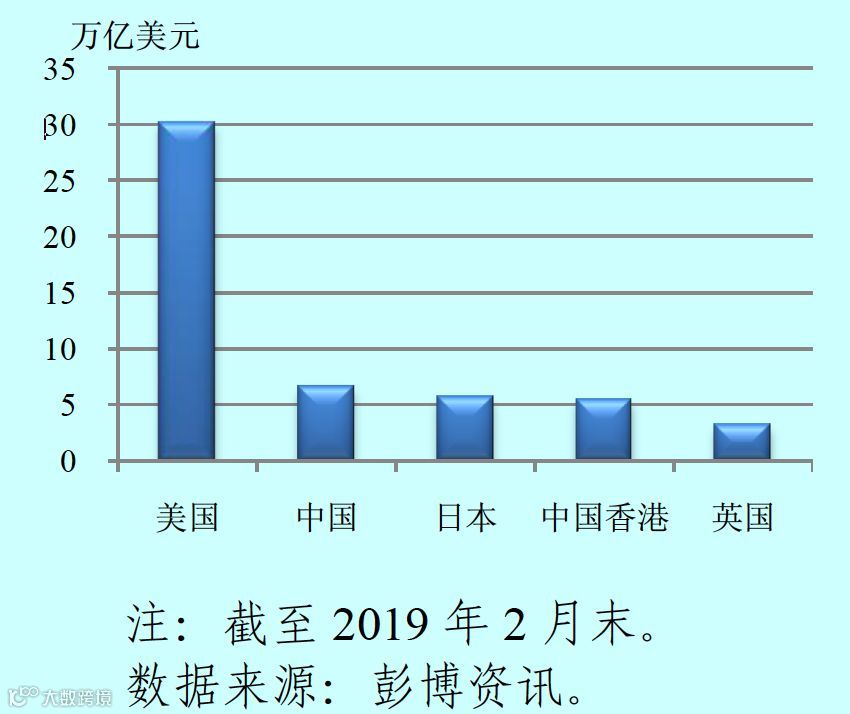 彭博统计,2019年2月末,中国股市市值(6.7万亿美元)排名全球第二,美国股市以30万亿美元排名第一,日本(5.73万亿美元)排在第三位。