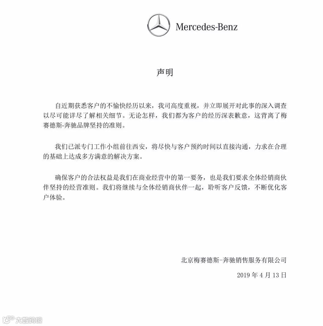 13日下午5时许,奔驰官方发布声明,称对客户的经历深表歉意,已派专门工作小组前往西安,将尽快与客户预约时间以直接沟通,力求在合理的基础上达成多方满意的解决方案。