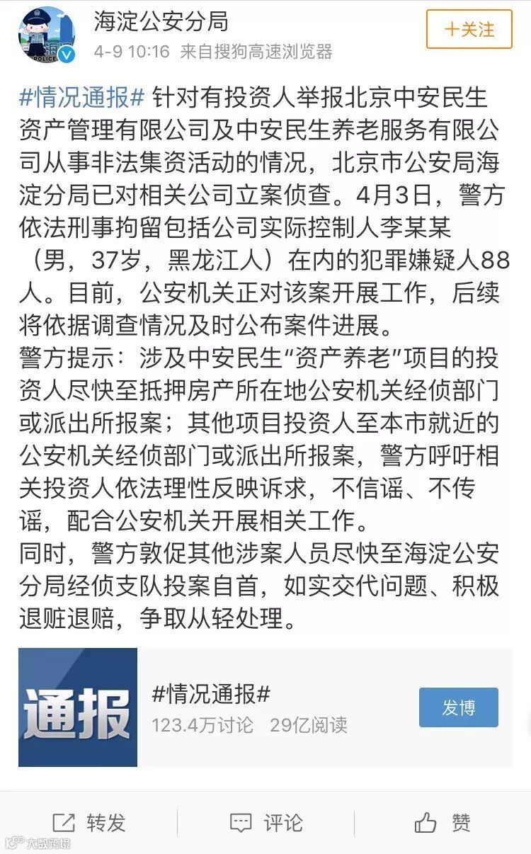 4月9日,北京市公安局海淀分局发微博称,针对群众举报其辖区北京中安民生资产管理有限公司(中安民生资管)及中安民生养老服务有限公司(以下通称中安民生养老)从事非法集资一事,经海淀警方侦查,对涉事公司实际控制人李某某等88名犯罪嫌疑人刑事拘留。