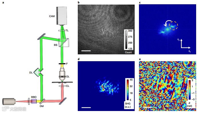 二次谐波显微技术(SHGM)已成为一种非常有价值的无标记成像技术,并在生物医学应用领域,从活细胞成像到癌症诊断有着重要应用。由于非线性磁化率的非零值只存在于缺乏反转对称性的材料中,因此二次谐波场可以高特异性适用于花丝组织的分子。生物组织中的SHGM信号主要由特定类型的胶原纤维、肌肉纤维中的肌球蛋白和极性微管决定。选择性成像组织细胞外基质中的胶原蛋白的能力已被开发用于研究肿瘤微环境,作为表征癌症侵袭性的标志。传统的激光扫描SHGM依靠固有的光学切片能力,是由紧密聚焦的,短激光脉冲提供。这将SHG散射限制在射光脉冲的焦点的一个小体积范围内,SHGM成像依赖于基束的强度和相位的空间变化,也依赖于谐波团的空间分布和相位匹配。相干SHG散射过程的相位匹配常常使图像的定量解释变得含糊不清。传统成像需要扫描聚焦的基束,然后进行单点检测。
