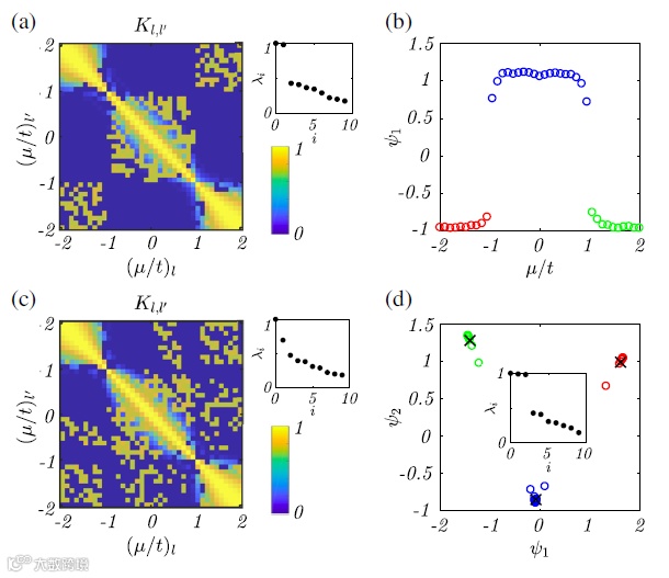 随着拓扑绝缘体概念的出现,大量的研究工作集中在进一步支撑这种非平庸系统的理论理解和材料实现上。在过去的两年中,考虑到晶体对称性的作用,在对拓扑带结构进行系统分类上取得了具体进展。另一个活跃的研究领域是将机器学习(ML)技术应用于物理学。有许多应用,例如在材料科学和密度泛函理论中提供蒙特卡洛采样的波函数加速的变化表示,以及检测相变。关于后者,已经确定,由于缺乏局部有序参数,拓扑相变通常比对称性破缺相变更难捕获。尽管已经取得了一些进展,但是大多数学习拓扑相的方法都依赖于监督学习(需要标记数据)和/或手动特征工程,同时考虑了关于拓扑相的先验知识。然而,J. F. Rodriguez-Nieva等人提出了一种无监督的机器学习方法来基于原始数据的拓扑特性对样本进行分类。关键思想是将样本视为图上具有节点对的节点。图的全局结构可以表示为由扩散图构造的低维嵌入;反过来,这揭示了不同的拓扑类别。
