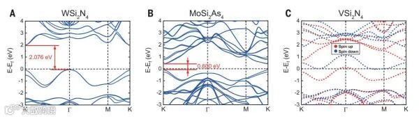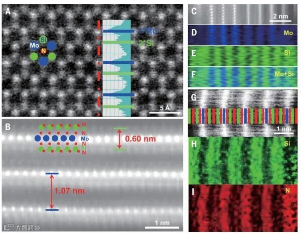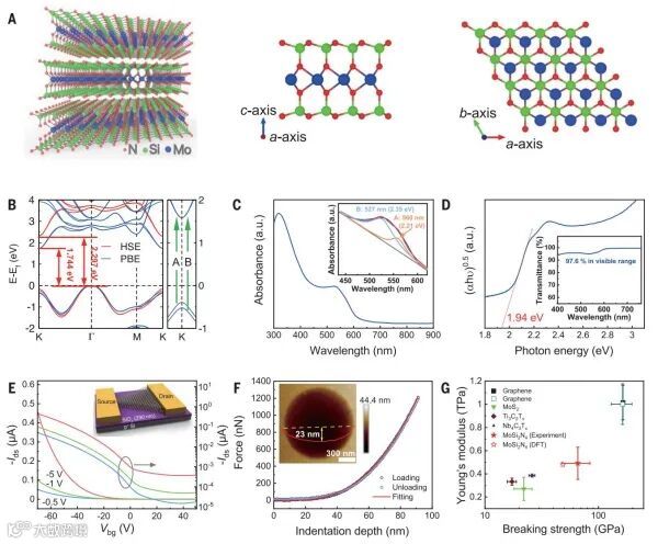 层被两个Si-N双层膜夹住。测试表明,它是一种半导体(带隙~1.94 eV),具有高强度(~66 GPa)和显著的稳定性。