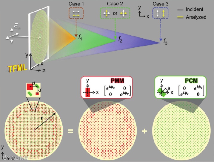 透镜广泛地应用于望远镜、显微镜、相机等成像领域或者用来聚焦光束的光刻和切割等加工领域。传统透镜的原理决定了它曲面的形状,因此通常较难加工且功能单一。超构透镜是一种使用半导体加工技术制造的平面光学元件,未来有希望代替传统透镜。然而动态地调整透镜的参数如焦距仍然比较困难。而利用偏振多通道的策略,可以实现透镜在横向、轴向甚至三维的多焦点聚焦,并可实现焦点的偏振切换。图(4)所示,采用了偏振三通道,将传播相位与几何相位结合起来,在纵向上实现了三个可变的焦距。