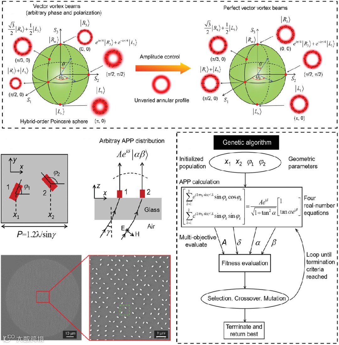 以往的矢量涡旋光的环形强度往往取决于拓扑荷数而无法生成强度均匀的光环。图(12)显示了一种生成完美矢量涡旋光束的单层超构表面。该超构表面每个像素单元由两个相同的纳米结构组成,具有不同的位置和旋转角。因此,在这个设计中有四个参数可以被调控,重要的是,这四个参数足以实现光的振幅、相位、偏振参数的完全控制,并且用遗传算法可以根据需要的四个目标光场参数求解出四个几何参数。实验通过超构表面产生了完美的矢量涡旋光束,证实了超构表面可以实现独立和任意控制光的振幅、相位和偏振。