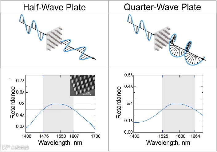 图(2)半波片和四分之一波片的示意图。下边图片对应了不同波长的光在两个方向上产生的相位差。