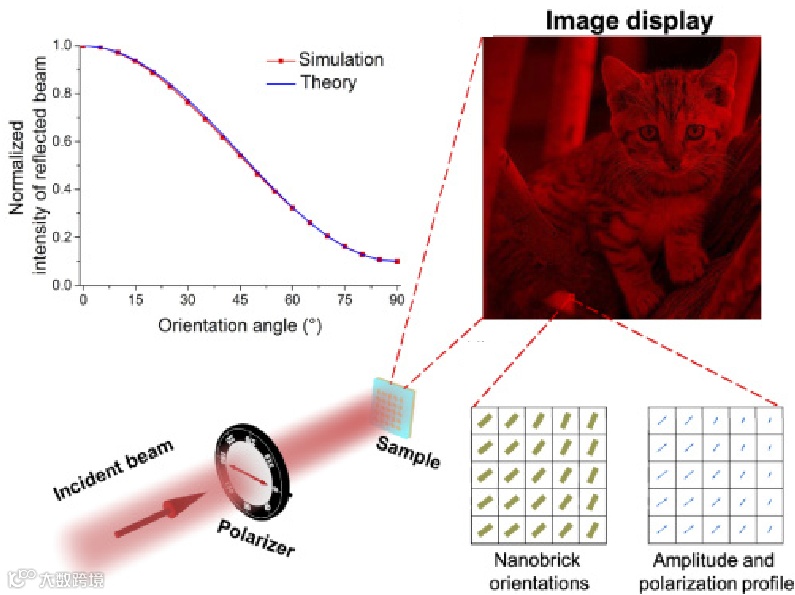 纳米印刷是近年来一项基于纳米结构的振幅调控的新兴技术。可实现超高分辨率化学稳定的图像显示,包括单色显示和彩色显示。然而,纳米印刷通常是基于纳米结构的共振来实现波长选择性和彩色图像的显示。偏振和振幅的同时调控为纳米印刷设计提供了一种新的方式。图(10)显示了一种高保真灰度图像显示方法,通过优化双折射单元尺寸,将结构设计成反射模式下的偏振器,在两个方向上形成不同的反射率,再结合马吕斯定律,通过合理地设计结构旋转角,从而控制每个像素的振幅,实现高清晰度的连续灰度图像。