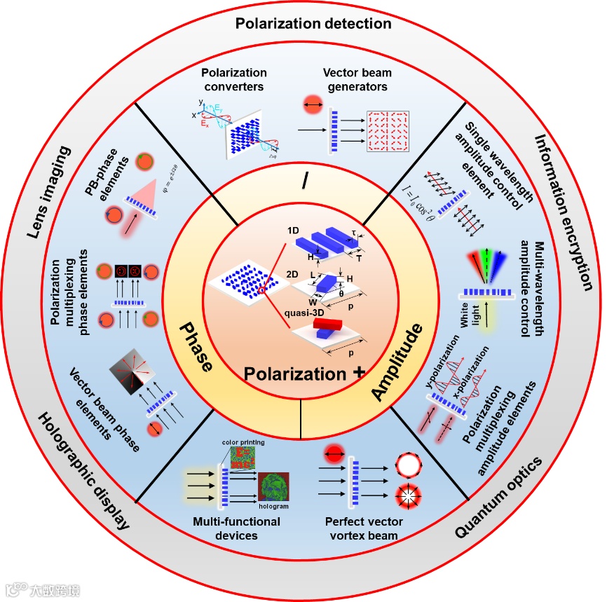 除了相位调控,超构表面还能够调控光波的各种参数包括光振幅、频率、偏振,从而具有丰富的功能,广泛应用于完美吸收器、结构色、彩色全息、消色差元件、非线性光学等,这引起了科学界的广泛兴趣。这其中,与传统光学元件相比,亚波长尺度像素的偏振调控是超构表面的一种独特能力。结合相位和振幅的调控则可以实现更多的功能。近些年来,人们为充分利用超构表面的这一能力做了大量工作,展示了各种新功能和新应用。