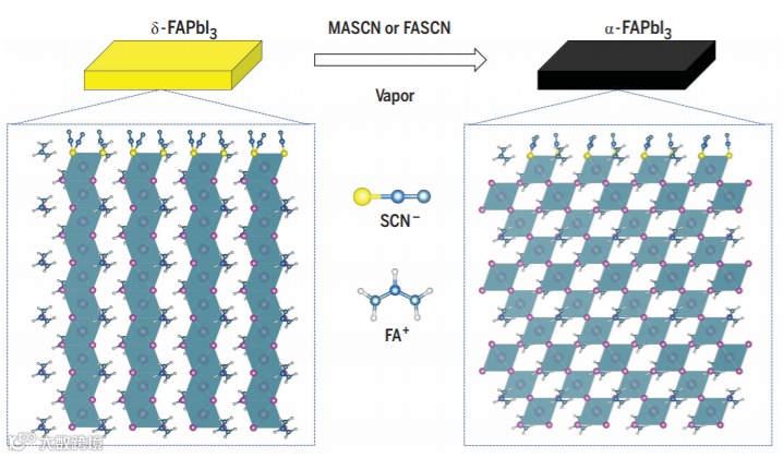合作团队深入研究FAPbI3的相变机理,创新性地开发了MASCN(硫氰酸甲基铵)气相辅助生长技术。基于此项技术,能够在较低退火温度下(100°C)成功将FAPbI3从d相完全转化为a相,并保持长期稳定。