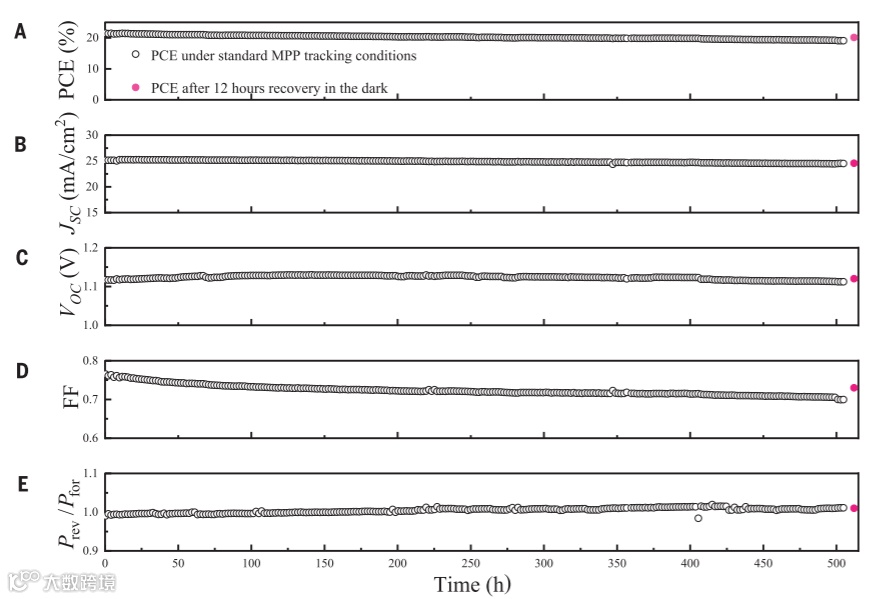 气相辅助沉积FAPbI3电池工作条件500小时稳定性研究: