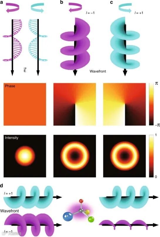 图七:手性光。a l=0的圆偏振光。顶行为电场空间分布,中行为相位分布截面,底行为强度分布截面。b l=−1和c l=+1 OAM。顶行:波前,中行:相位分布截面,底行:强度分布截面。d螺旋二色性图解。携带l=+1(蓝色)光的OAM光与手性物体相互作用微弱,而携带l= - 1(粉色)OAM光与手性物体相互作用强并被吸收。
