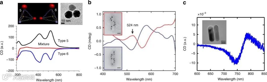 图一:实验实现的小等离子体手性粒子及其圆二色谱。a不对称的锥体,b由等离子纳米球组成的螺旋体,c由扭曲的纳米棒组成的二聚体。