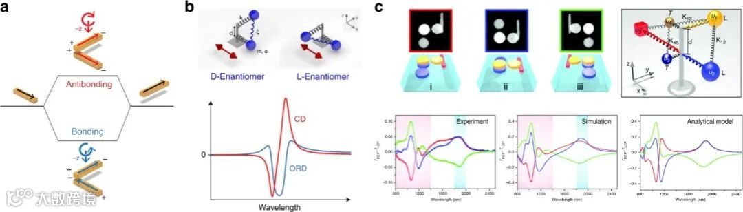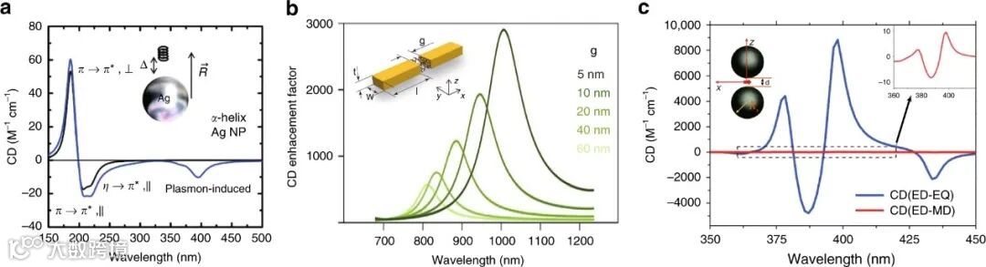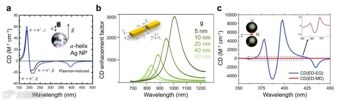 图三: 等离子体增强圆二色性的理论重建。a靠近等离子体球的手性分子,b嵌入在等离子体间隙天线中的手性介质,c嵌入在等离子体二聚体中偶极跃迁以外的手性分子。