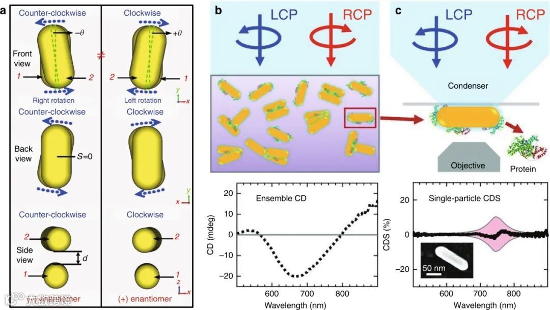 图五:结构微扰带来的等离子体手性。a不同手性分子的不对称性性决定了等离子体纳米od二聚体的不对称性。B对于粒子系综的手性信号测量,c对于单粒子手性信号的测量。