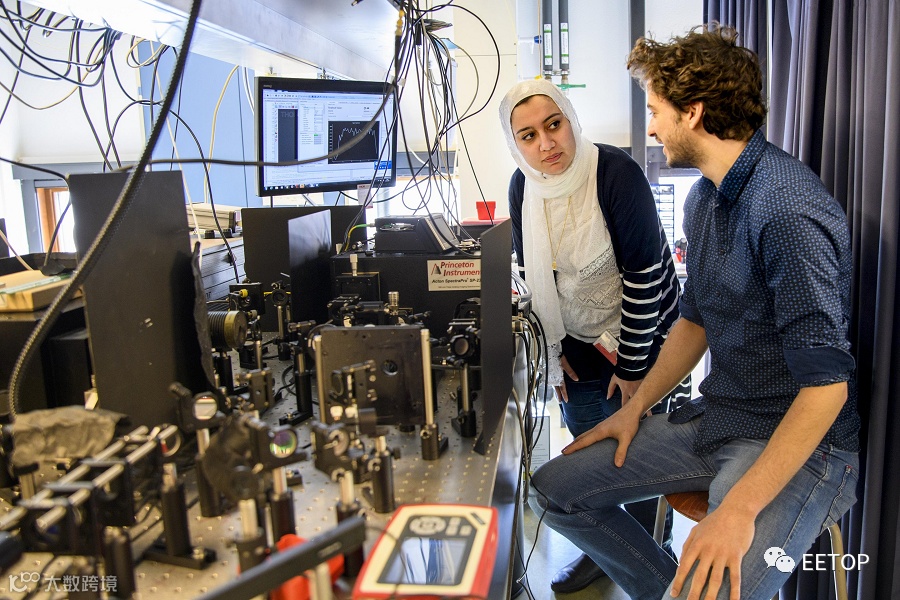 共享第一作者Elham Fadaly(左)和Alain Dijkstra(右)使用光学装置来测量发射的光。