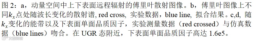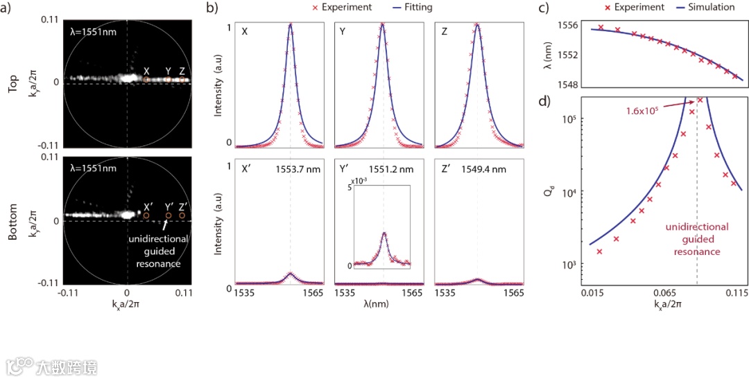 实验中,联合课题组利用自主发展的倾斜刻蚀工艺制备了光子晶体样品,并搭建了近远场共焦测试系统,同时对光子晶体平板上下表面辐射进行了测量,实验上观测到了高达1.6e5的单面品质因子,即27.7 dB的非对称辐射比,如图2所示。这意味着超过99.8%的光子能量都朝一侧定向辐射。该结果相比传统设计高出1~2个数量级,证明了单向导模共振态在实现定向辐射上的有效性和优越性。