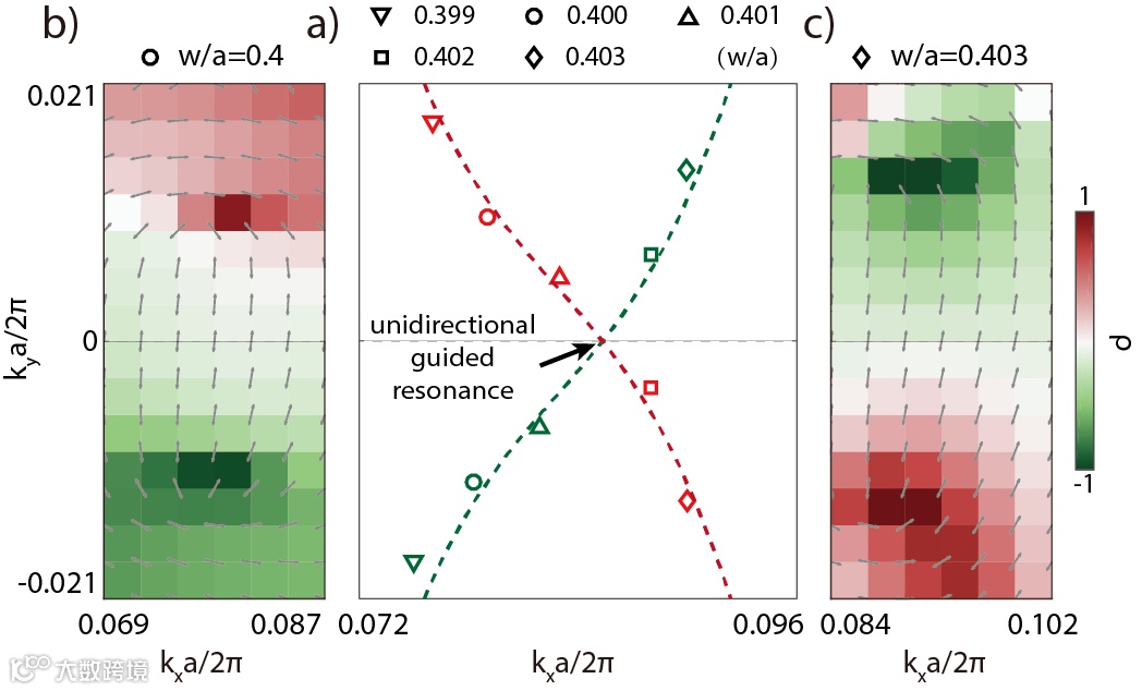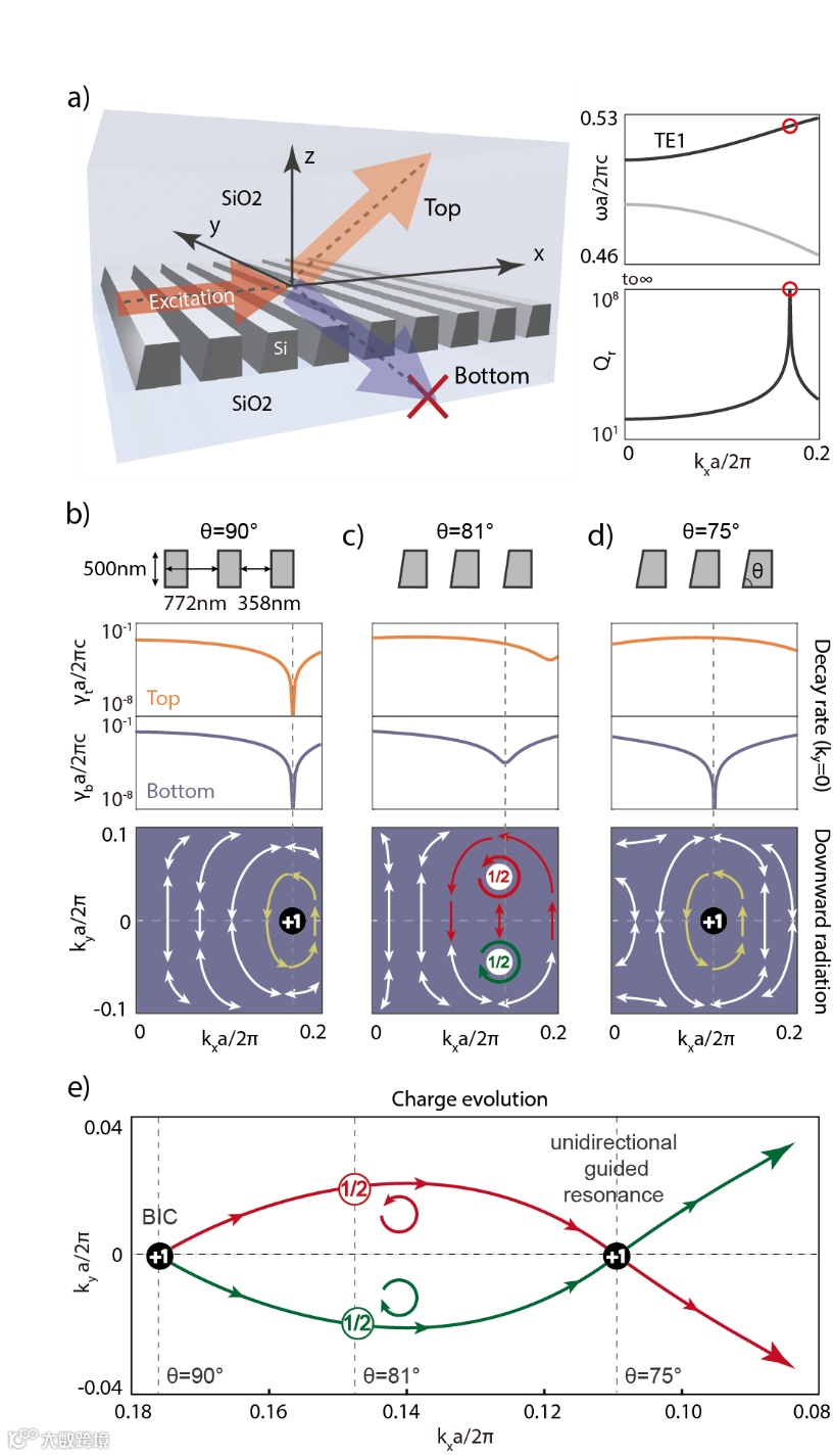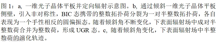 为了在光子晶体平板上实现定向辐射,联合研究团队提出了拓扑荷分裂再合并机制。在一维光子晶体中,通过倾斜侧壁同时破缺结构垂直对称性和面内对称性,使体系中BIC态携带的整数拓扑荷分裂为一对由圆偏振态携带的半整数拓扑荷,并在平板上下两侧表面产生大小不等的辐射。这时维持对称性破缺,调控参数将一侧表面的成对半整数拓扑荷重新合并成整数拓扑荷,即形成不依赖镜面仅朝一个表面辐射能量的单向辐射导模共振态(Unidirectional guided resonances, UGRs),如图1所示。