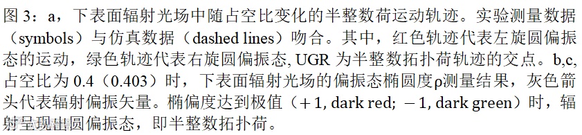 进一步地,联合研究课题组通过测量下表面辐射光场的偏振态重构了偏振矢量场,这样直接定位了半整数荷在动量空间的位置,并研究了参数调节过程中半整数拓扑荷的演化轨迹。实验成功观测到了半整数拓扑荷合并现象,如图3所示,进一步验证了UGR态的拓扑本质。