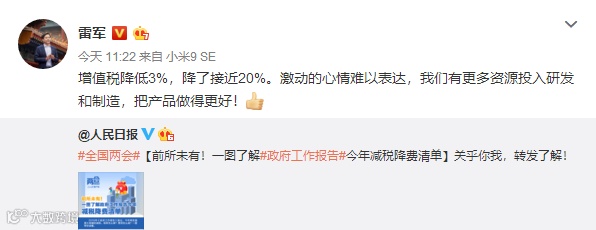值得一提的是,小米集团副总裁、红米Redmi品牌总经理卢伟冰今日发微博称:“降税3个点。Redmi死磕极致性价比的空间感觉又大了!更能打了!”雷军也同样感慨,称“激动的心情难以表达,我们有更多资源投入研发和制造,把产品做得更好!”