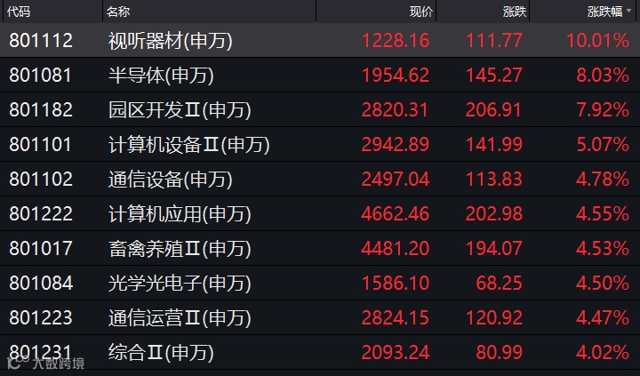 从行业指数涨幅情况看,视听器材、半导体、园区开发、计算机设备、通信设备、工程机械等涨幅居前。