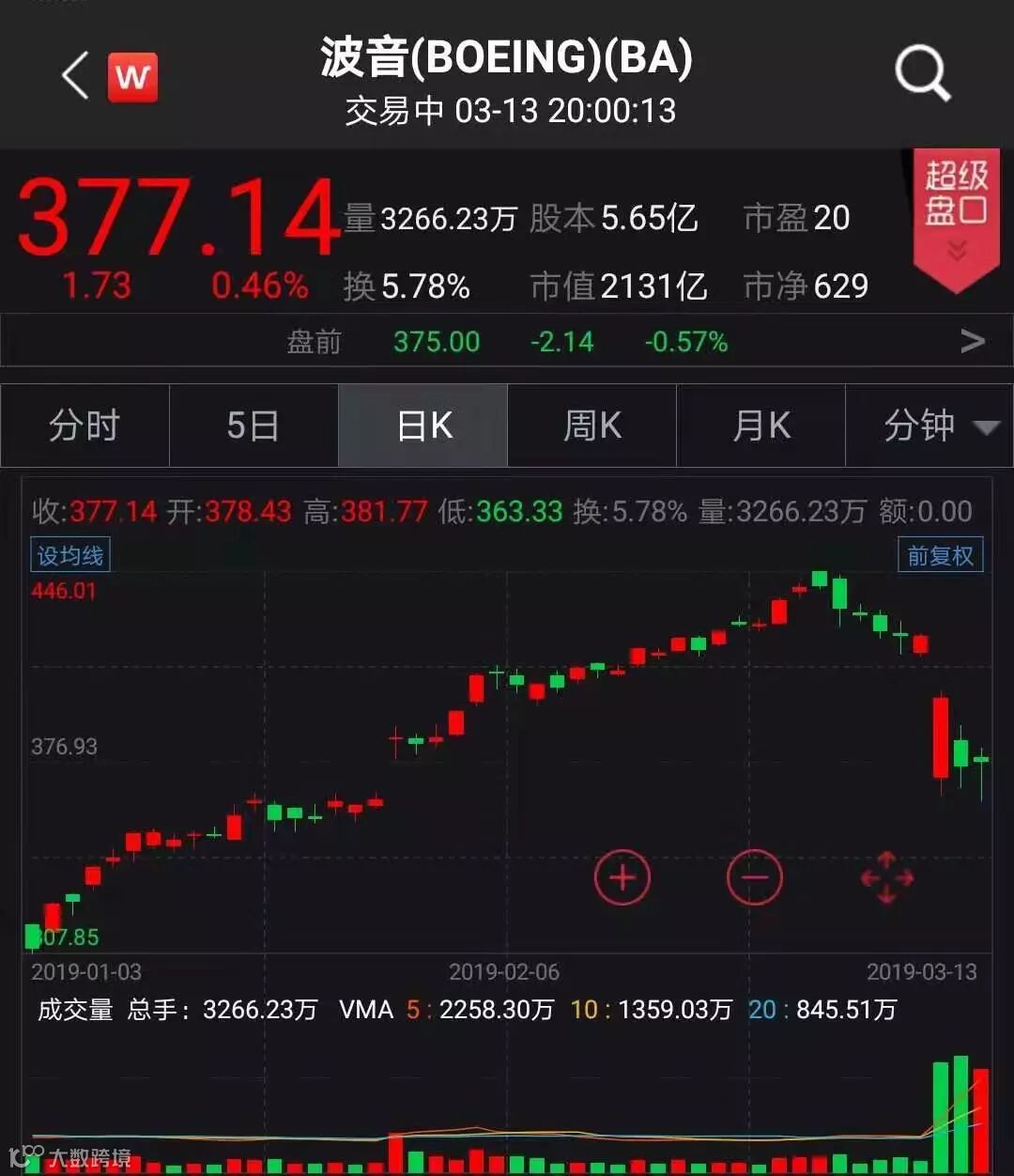特朗普宣布停飞737MAX后,波音股价盘中一度下跌3%,最终收涨0.46%,报377.14美元。自埃塞俄比亚空难以来,该公司股价已下跌约13%,市值蒸发逾250亿美元。
