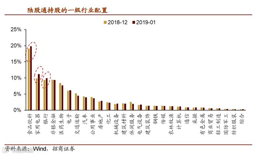 据招商证券统计,截至2019年1月31日,陆股通持股主要集中在食品饮料、家用电器、银行、非银金融、医药生物等行业,这一行业分布与MSCI成分股市值占比高度一致。