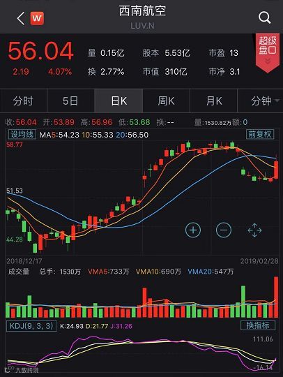 美国当地时间2月28日,美国西南航空公司股价上涨4.07%,为1月24日以来的最大单日涨幅。2019年初至今,该公司股价累计上涨20.57%。