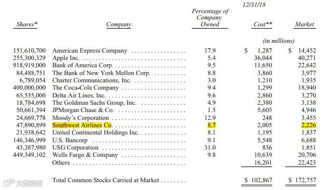 巴菲特旗下的伯克希尔·哈撒韦公司是西南航空公司的第二大股东。根据伯克希尔·哈撒韦2月23日发布的《致股东的一封信》显示,该公司持有西南航空公司8.7%的股份,价值超过22亿美元。伯克希尔·哈撒韦也是西南航空公司竞争对手达美航空及联合大陆控股公司的最大股东之一。