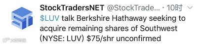 关于巴菲特考虑收购西南航空公司的传闻出现在推特上。推特用户StockTraders.net当地时间28日发推文称:“伯克希尔·哈撒韦公司寻求以每股75美元的价格收购西南航空公司的剩余股份。”该报价较27日西南航空公司股价53.85美元溢价39%。