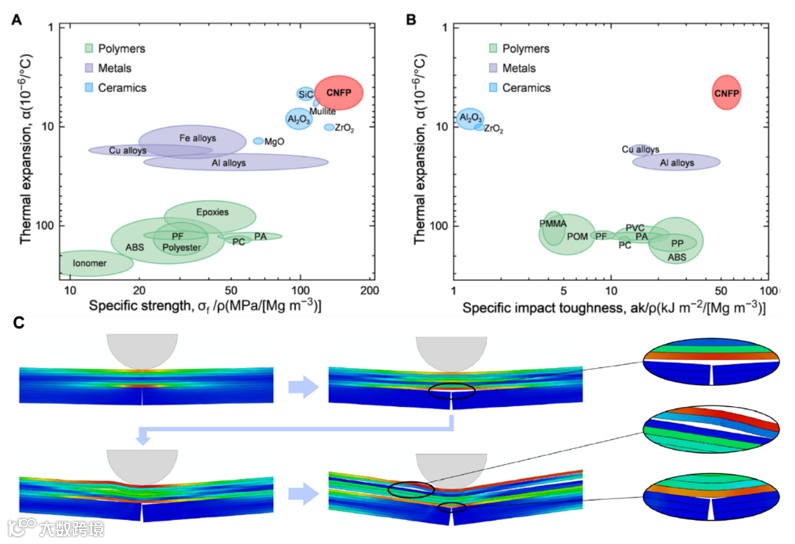 图3. CNFP、金属、陶瓷和聚合物材料的比冲击强度与热尺寸稳定性(A)和比冲击韧性与热尺寸稳定性(B)Ashby相图;(C)CNFP冲击断裂FEM模拟