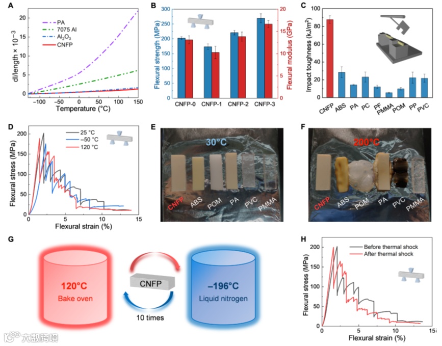 图2. 各种CNFP的力学性能测试;(A)CNFP、AL2O3、Al和PA的热膨胀情况对比;(B)各种CNFP的冲击强度和模量;(C)CNFP与其它常见聚合物材料冲击韧性对比;(D)CNFP在不同温度下的弯曲应力-应变曲线;(E)和(F)分别是CNFP和常见聚合物的耐热性对比;(G)和(H)是CNFP的热冲击处理示意图和热冲击处理前后弯曲应力-应变曲线对比