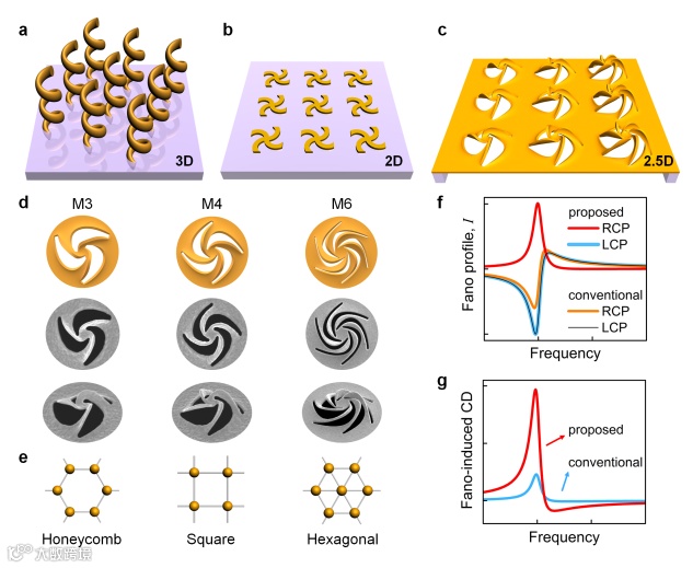 图1: (a) 3D超材料;(b) 2D平面超表面;(c) 2.5D立体超表面;(d,e)不同类型的超分子结构及排布晶格;(f,g)Fano共振线型及对应的圆二色性增强机制。