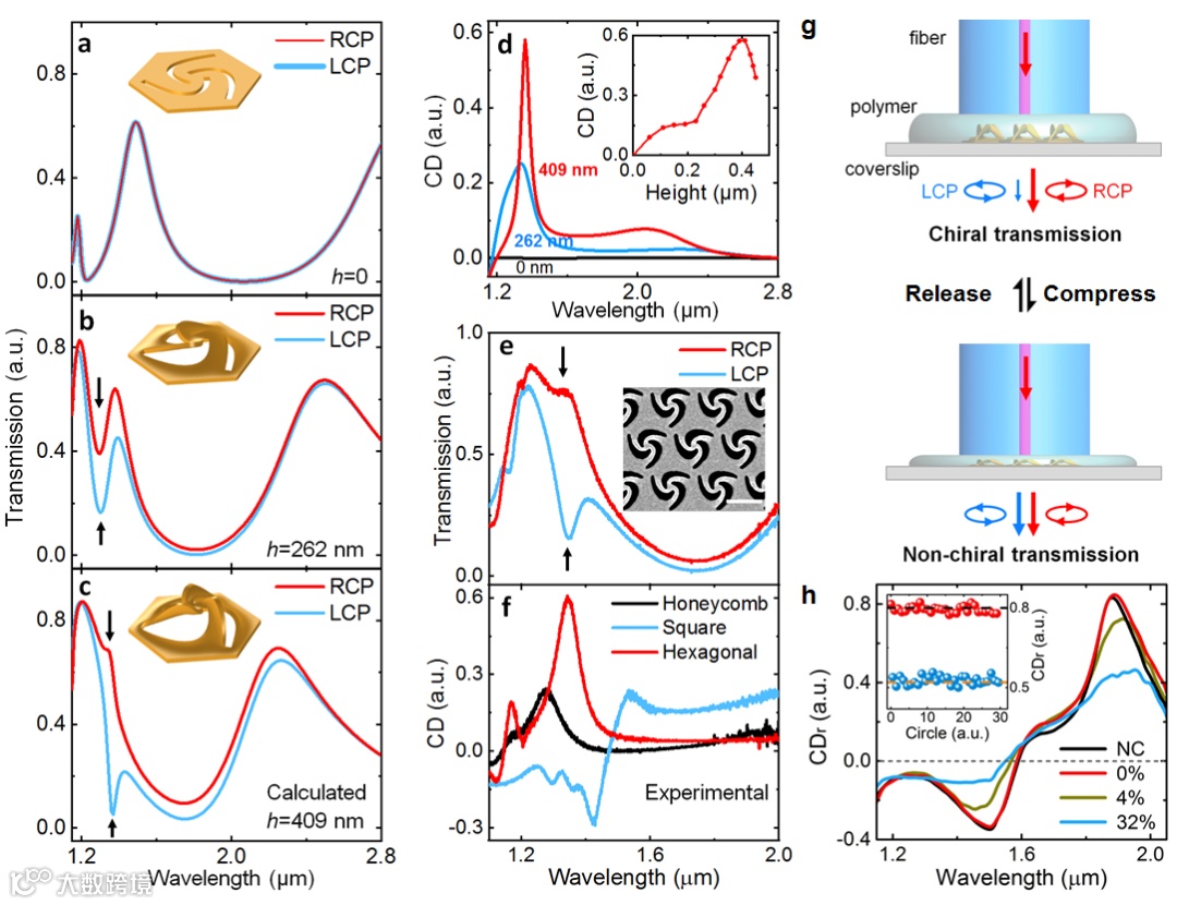 图2: (a-f) Fano共振增强的圆二色性(CD):(a-d)理论模拟;(e-f)实验研究。(g)立体超表面CD动态调谐示意图;(h)不同压缩比例情况下的CD光谱及(插图)30个循环动态调谐下的CD强度。