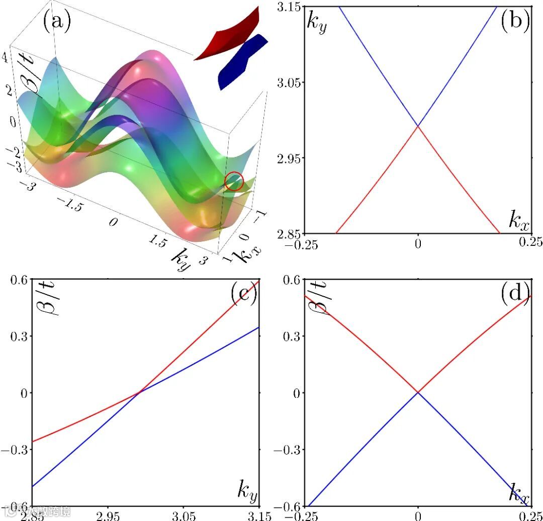 图3:基于离散模型的能带结构图。(a) 参量角为60。的能带结构。红色圆圈为研究的第II类狄拉克锥。插图为该狄拉克锥的放大图。(b) 狄拉克锥在β=0平面上的横截面。(c) 狄拉克锥在kx=0平面上的横截面。(d) 狄拉克锥在ky=4π/3a平面上的横截面。