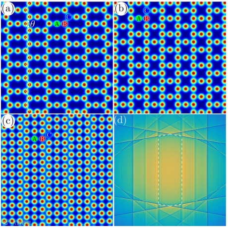 图1:第II类狄拉克光晶格的构建过程。晶格单元包括三个位置,分别用字母A、B和C表示。(a) 参量角为120。的光晶格结构。(c) 参量角为90。时光晶格结构——位错Lieb光晶格。(c) 参量角为60。时光晶格结构——第II类狄拉克光晶格。(d) 参量角为60。时光晶格的远场衍射图,虚线表示第一布里渊区。