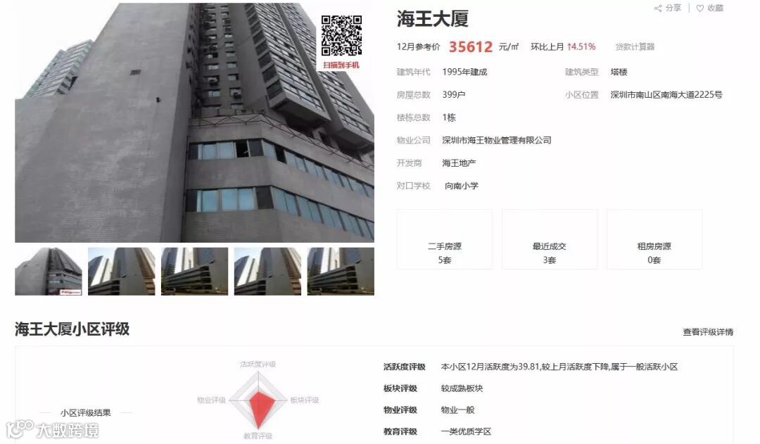 深圳房天下信息显示,该小区属于深圳成交一般活跃小区,主要卖点是学区。目前同一小区2018年12月参考均价在3.5万元/平方米。有业内人士表示,海王大厦建成时间较久,居住环境一般,小区住户与商家混杂,上市公司房产难以卖出或许是定价偏高。