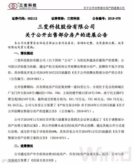 三变科技近期公告显示,公司9折优惠卖房已经收到成效。公司此前拟通过挂牌出售其持有的9处房产,其中5处由于无意向方而未能卖出。公司决定终止未卖出的5套房挂牌,同比拟以9折价格处理前述房屋。截至目前,其中3处房产已交易完成,公司预计这3处房产交易将对公司本年度净利润影响约为990万元。