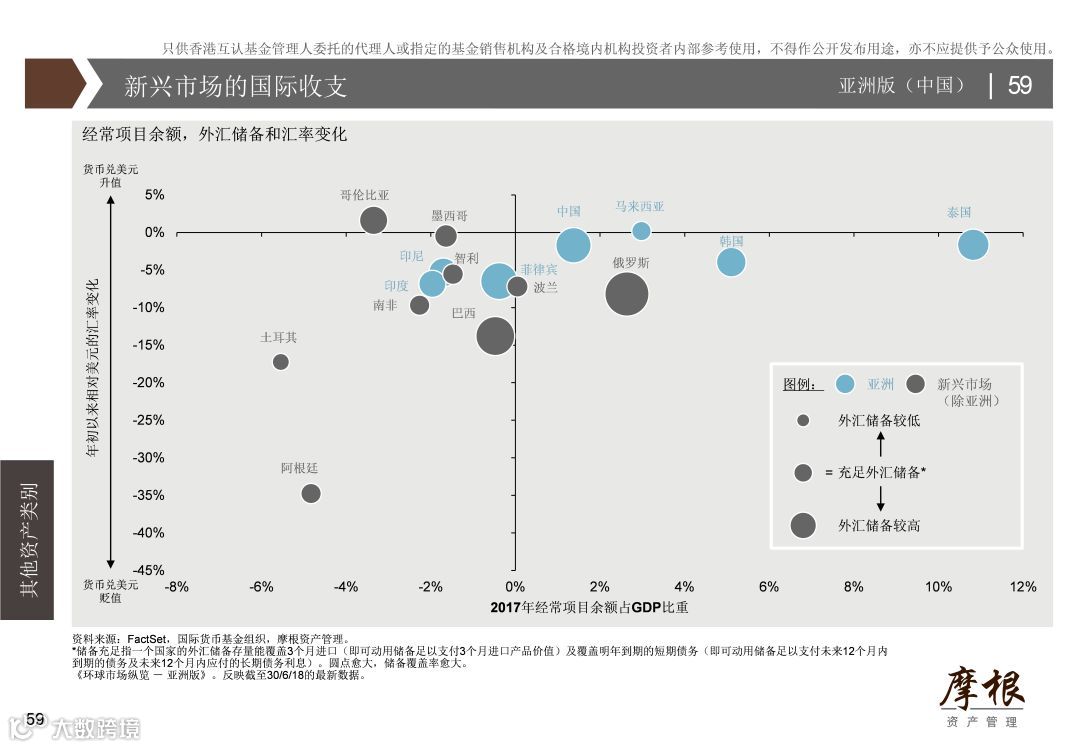 如图所示,今年以来汇率贬值最为严重的土耳其和阿根廷。相较之下,亚洲地区新兴经济体经常项目和外汇储备水平总体较为健康,且消费和投资增长仍保持稳健,因而发生风险事件的概率较低,东盟地区亦是较为看好的新兴市场投资标的。