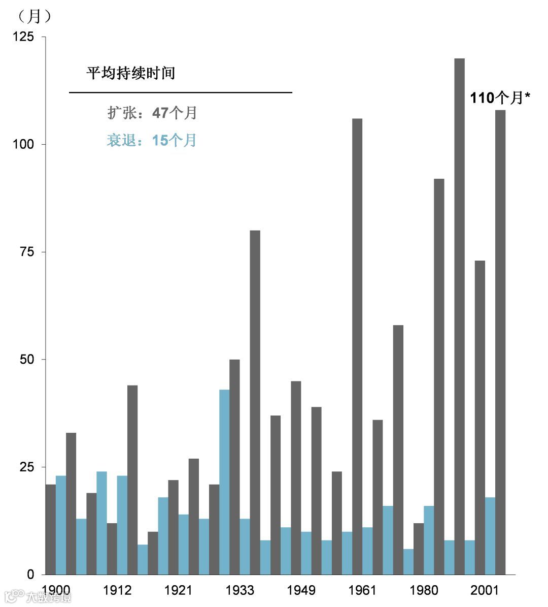 *110个月为本轮经济扩张从2009年7月开始持续至2018年8月的时间。经济扩张和衰退的数据由国民经济研究局网站(www.nber.org/cycles/)获得。