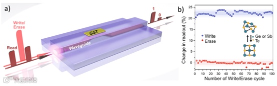 图2 光学相变存储器的不同实现方案。a 信息存储在纳米光波导顶部的GST段的相位态中。b 对5微米GST器件在晶体态与非晶态之间的二进制存储操作的演示,可以在同一开关周期中多次重复。