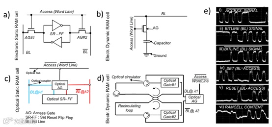 图3 a 电子6T SRAM单元。b 光学SRAM单元示意图。c 电子DRAM单元。d 带有循环光纤环路的光学DRAM单元。e 光学SRAM单元在10Gb/s的写入速度下的脉冲测量图,从上到下依次为:i) 反向存取位,ii) 输入位线信号,iii) 反向位线,iv) 设置与v) 重置信号,vi) RAM单元的内存内容。