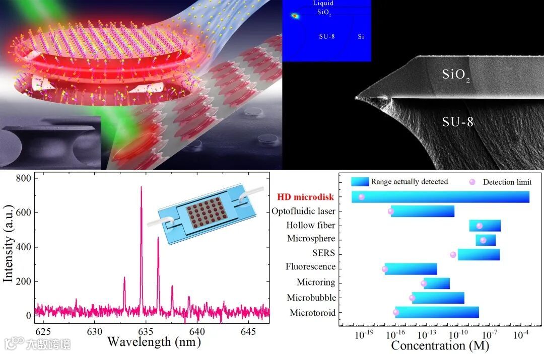 图1 超灵敏双曲面鼓型微腔激光生物传感器示意图、电子显微镜图、光谱图及微流控装置、不同光学生物传感器对比。