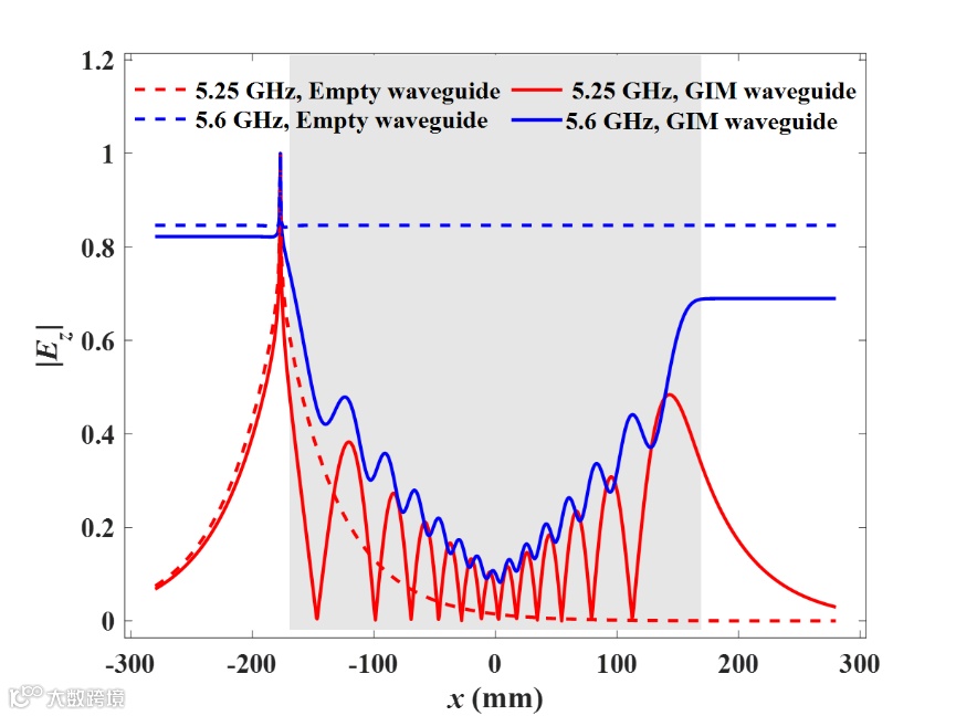 此外,该工作还从数值上对比了不同频率下空波导与渐变波导中电场随着传播距离的强度变化(如图2所示)。