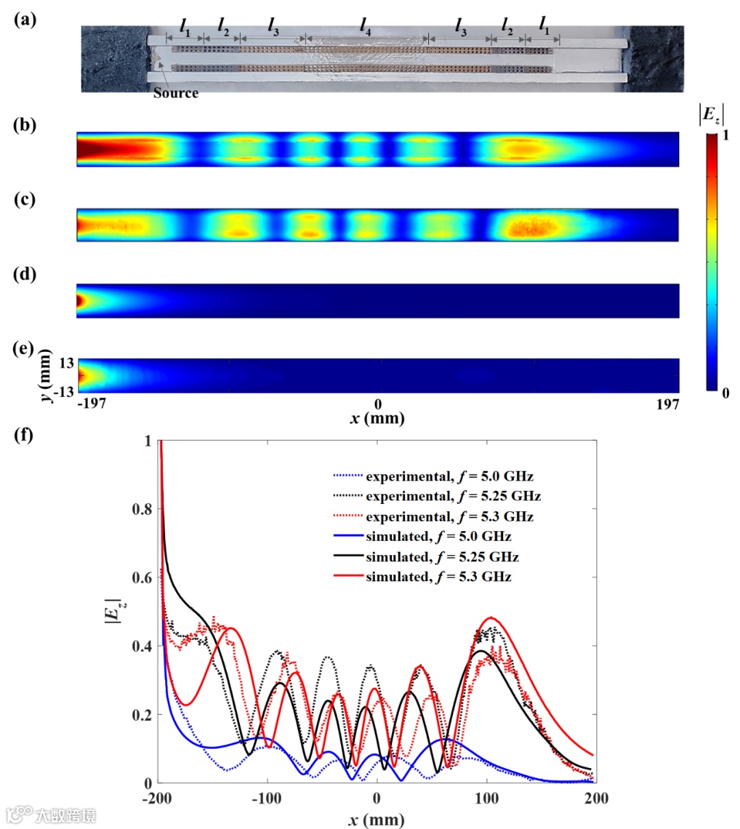 图3:三维仿真结果及实验测量结果。(a)加工的波导样品图;f=5.25 GHz时渐变波导的电场分布的仿真结果(b)及实验测量结果(c);f=5.25 GHz时空波导的电场分布的仿真结果(d)及实验测量结果(e);(f)不同频率下沿着渐变波导中y=0线上的仿真及实验结果。