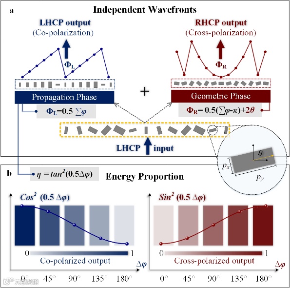 近年来,超表面的快速发展为电磁波的人工调控领域提供了宽广且丰富的研究空间。其中,基于几何相位调控原理的超表面(几何超表面,geometric metasurface)是调控圆极化电磁波最简单方便的方法,仅需要改变超表面单元的旋转角度便可在交叉极化出射场中引入所需的相位分布。根据Pancharatnam–Berry 相位的物理机制可知,几何超表面只能影响出射场中交叉极化分量的相位响应,所以目前关于几何超表面的大部分研究工作都将重点聚焦在了尽可能地提高交叉极化转化率上。然而在实际操作中,无法实现所有单元结构的交叉极化转化率都同时达到100%,随之产生的同极化分量便无法被人为调节,造成了出射能量的损失与浪费,与此同时,同极化的传输通道也只能处于闲置状态。因此,开发对同极化传输通道的控制机制,从而实现对出射能量的整体高效率利用是一项意义深远的课题。