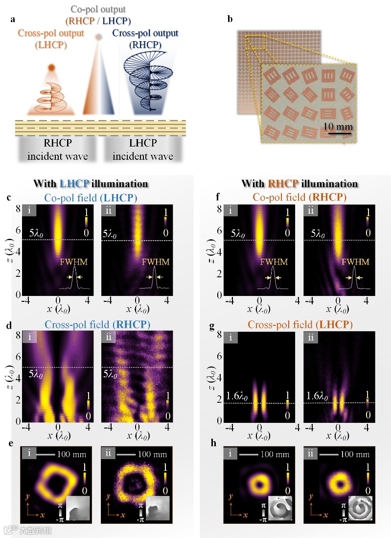 图2 超表面路由在圆极化波入射下的多功能波前验证。(a) 多功能波前调控方案示意图。(b) 该超表面路由的加工实物照片。(c) 在左旋圆极化波束的照射下,同极化出射场的能量分布呈汇聚波束分布,(d)-(e) 交叉极化涡旋波束的能量及相位分布结果。(f) 在右旋圆极化波束的照射下,同极化汇聚波束的能量分布结果,(g)-(h) 交叉极化出射场的能量分布呈汇聚型涡旋波束分布。其中,(i) 仿真结果,(ii)测试结果。