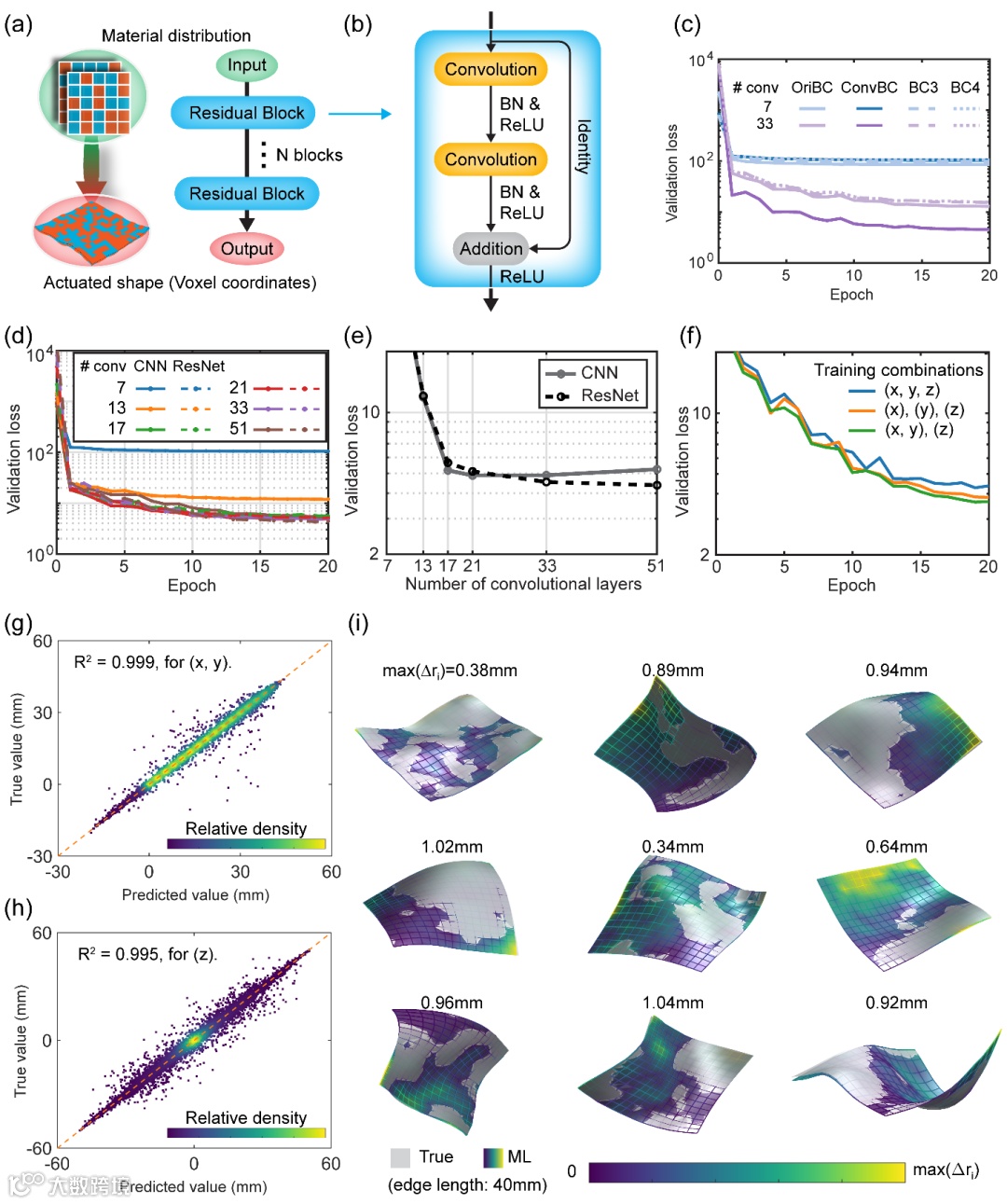 深度残差网络实现快速、准确的形状预测。作者使用有限元模拟生成机器学习模型的数据集(图2)。体素材料分布为模型输入,变形形状为输出。为提高模型泛化性,全体数据集包括四种具有不同图案特征的类型。为降低计算量,采用了基于几何对称性的数据增强策略:每一个模拟数据可以扩充为16个具有对称或转置材料分布的数据。通过对数据集类型、数据增强、边界条件选取、网络架构等方面的探索,作者发现深度残差网络取得了极佳的预测准确度(图3)。测试集上真实和预测形状的回归R2值达到0.995(x和y坐标)和0.999(z坐标)。值得一提的是,原始边界条件被转换为了三种边界条件,其均允许板受激发生自由变形(边界无反力或力矩);而模仿一角固支的边界条件显著提高了模型性能,表明具有一定空间顺序依赖性的形状更易被深度模型所学习。此外,机器学习模型进行1000次随机材料分布的形状预测所需时间仅为3.6秒,而同样的任务有限元分析需要约11-28个小时。这些表明机器学习模型实现了快速、准确的形状预测。
