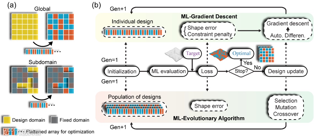 近日,佐治亚理工学院齐航教授团队,在基于机器学习的4D打印结构变形逆向设计研究中取得了新进展,使得设计和4D打印紧密结合的梦想离实现更接近了一步。在前期工作中 (Adv. Funct. Mater., 2022, 32, 2109805),受梁变形的顺序依赖性启发,团队提出了基于循环神经网络(RNN)的机器学习-进化算法(machine learning-evolutionary algorithm, ML-EA),实现了梁结构复杂目标形状的高效逆向设计。在此基础上,团队提出了一种可以和RNN无缝结合的顺序子域优化方法和拼接算法。顺序子域优化大幅降低了解的搜索空间,拼接则提高了模型的体素数目适应性与外推能力,二者结合实现了变体素配置下的亚秒级超快逆向设计,可有效用于变长度或复杂度的目标形状;利用几何对称性,进一步实现了晶格超结构的目标变形逆向设计。该工作以“Machine learning and sequential subdomain optimization for ultrafast inverse design of 4D-printed active composite structures”为题,于2024年2月在线发表于《Journal of the Mechanics and Physics of Solids》。以上工作针对梁或晶格结构的二维曲线变形,而具有三维曲面变形的板结构具有更为广泛的应用,其逆向设计也面临更大的挑战。为此,最近团队提出了基于机器学习模型的优化算法,实现了对机敏复合板结构的三维变形的高效预测和逆向设计。该工作以“Machine learning-enabled forward prediction and inverse design of 4D-printed active plates”为题,于2024年6月在线发表于《Nature Communications》。佐治亚理工学院齐航教授为通讯作者,孙晓昊博士、岳亮博士和余璐霞博士为共同第一作者。合作团队包括新加坡南洋理工周琨教授、法国Belfort-Montbéliard技术大学Frédéric Demoly教授,以及斯坦福大学赵芮可教授。