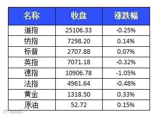 上周五,美股尾盘拉升,道指将跌幅收窄至约60点,纳指、标普均小幅上涨。截至收盘,标普500指数上涨1.83点,涨幅0.07%,报2707.88点;道指下跌63.27点,跌幅0.25%,报25106.26点;纳指上涨9.85点,涨幅0.14%,报7298.20点。上周,标普500指数累涨0.05%,道指累涨0.17%,纳指累涨0.47%。道指、纳指均实现周线七连涨。